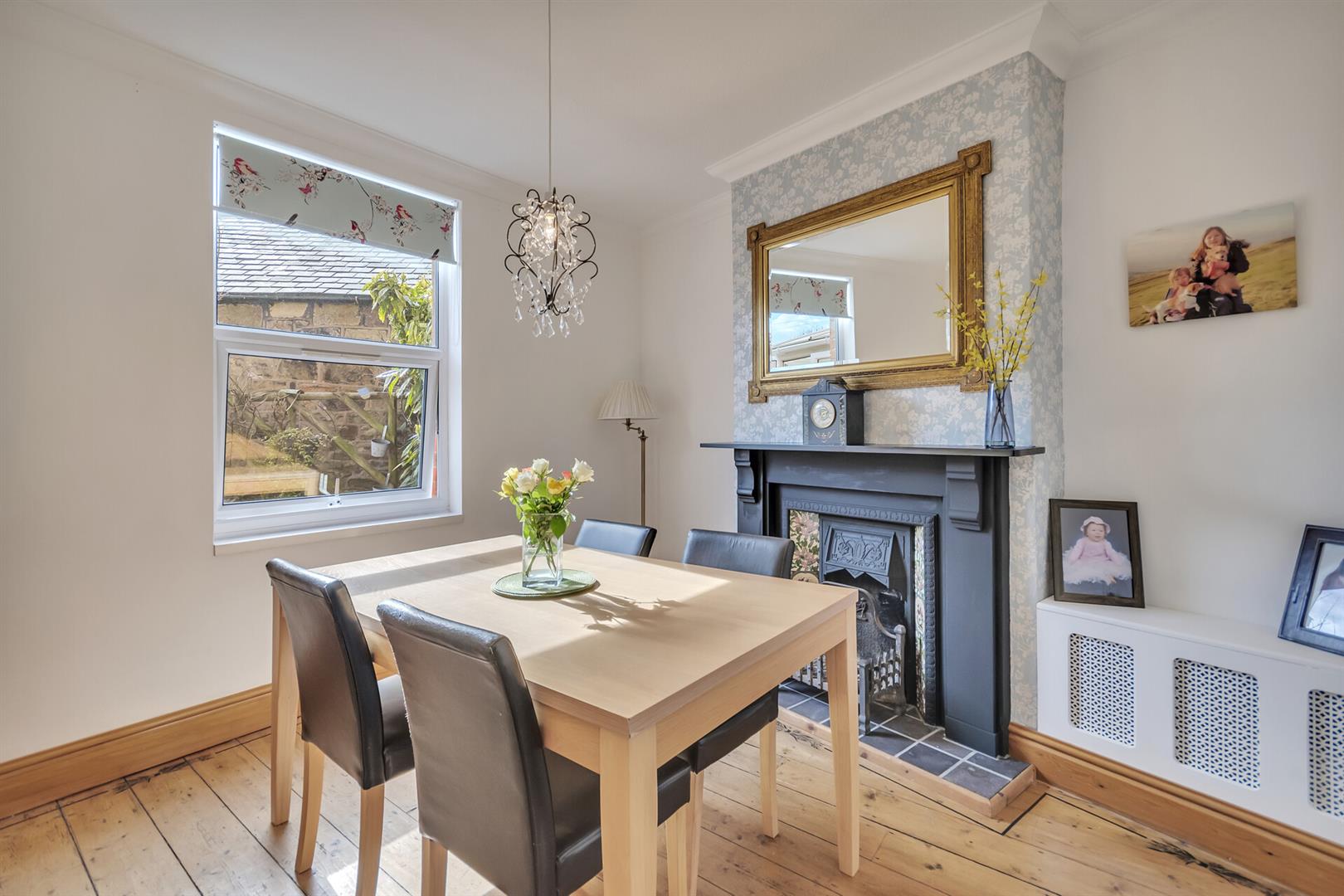 A charming room featuring an ornamental fireplace set within an attractive surround, complemented by bespoke tiled detailing. The space benefits from exposed wooden flooring, a window to the rear allowing for natural light, and a radiator.