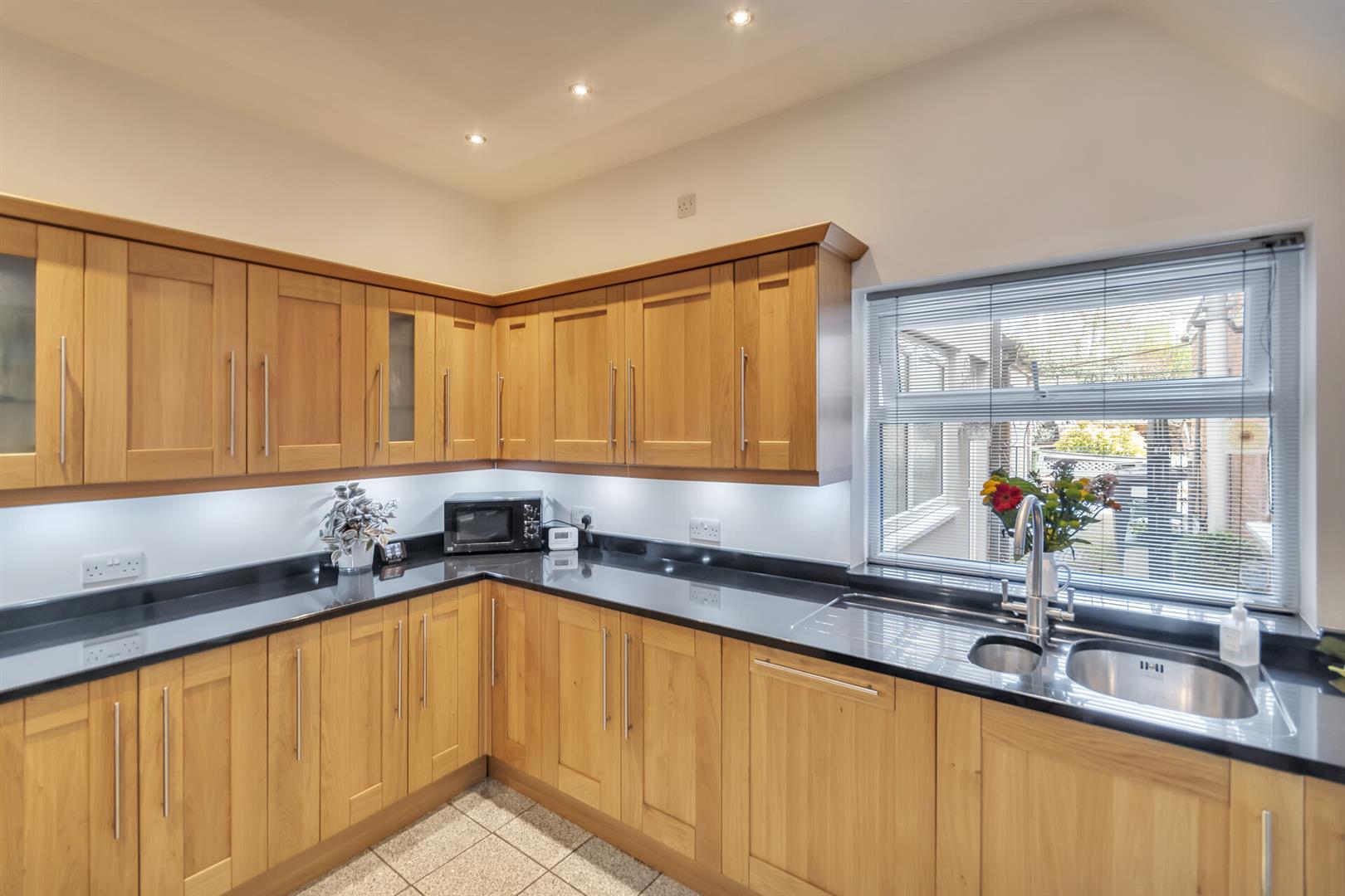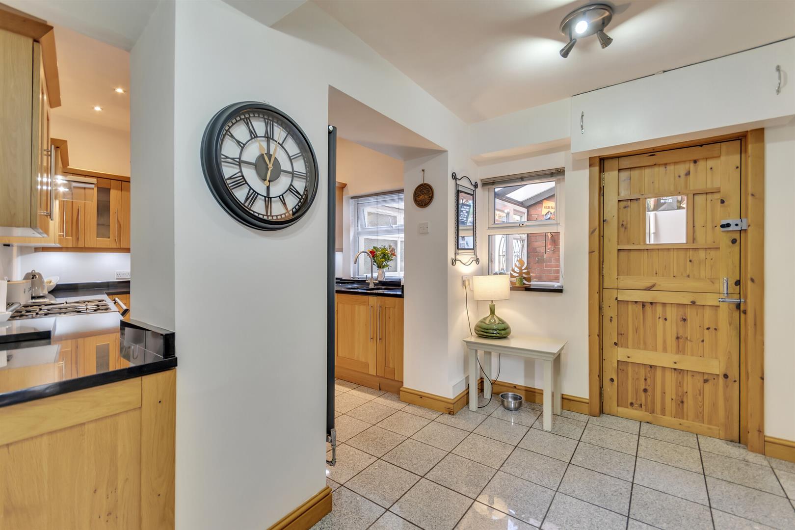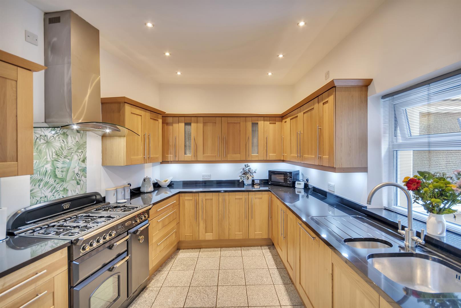 The breakfast area flows seamlessly into the kitchen, which is fitted with a comprehensive range of base and wall-mounted units, complemented by generous work surface areas. The kitchen incorporates a sink unit with mixer tap, positioned beneath a UPVC double-glazed window. Integrated appliances include a dishwasher, along with a Rangemaster cooker with extractor hood above and a feature splashback. Further benefits include a tiled floor, recessed spotlights to the ceiling, and a contemporary tall radiator, creating a stylish and practical space ideal for everyday living and entertaining.