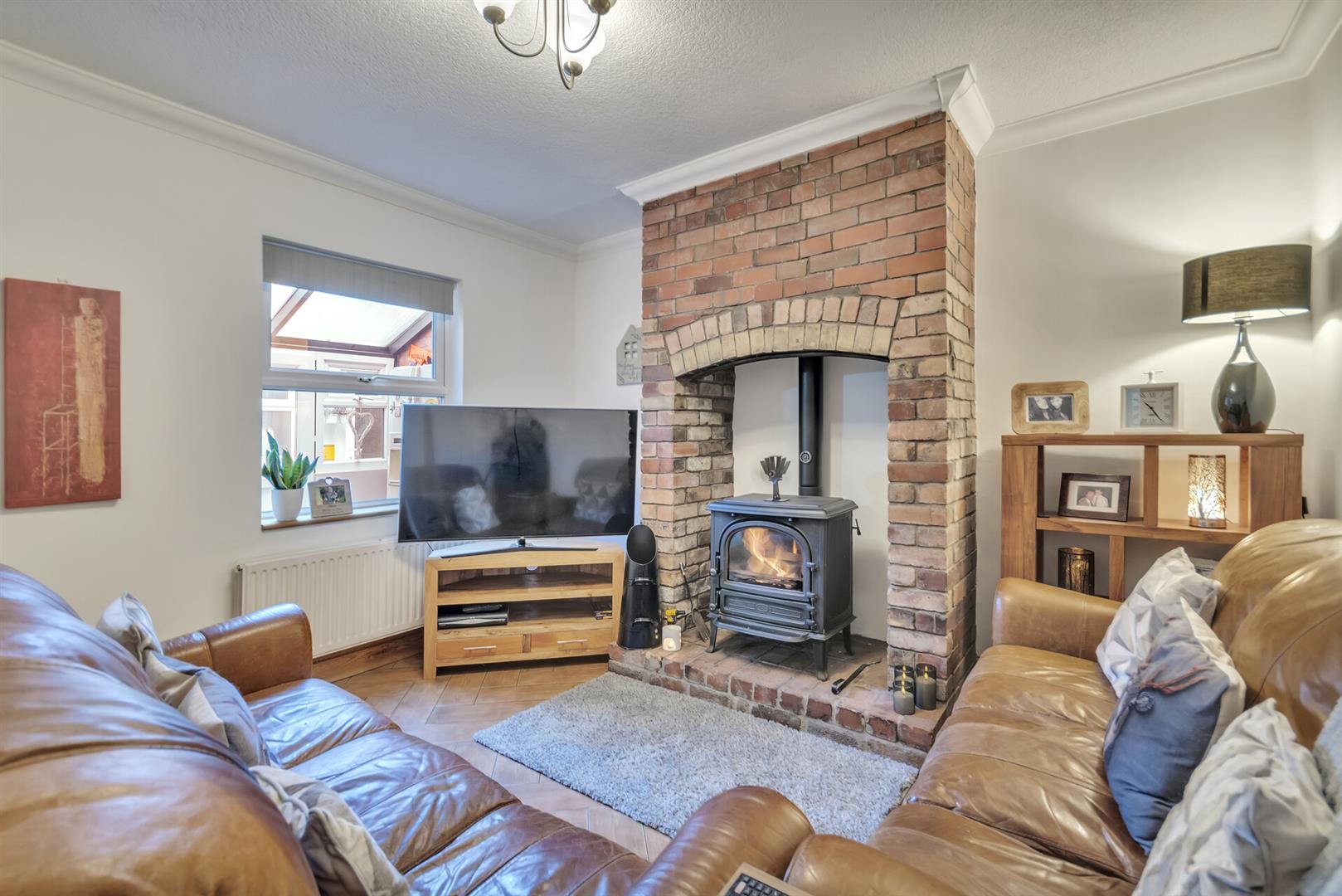 A spacious family room featuring a central wood burner set against an exposed brick surround, creating a striking focal point. The room benefits from wood flooring and offers access through to both the dining room and conservatory, making it ideal for family living and entertaining.