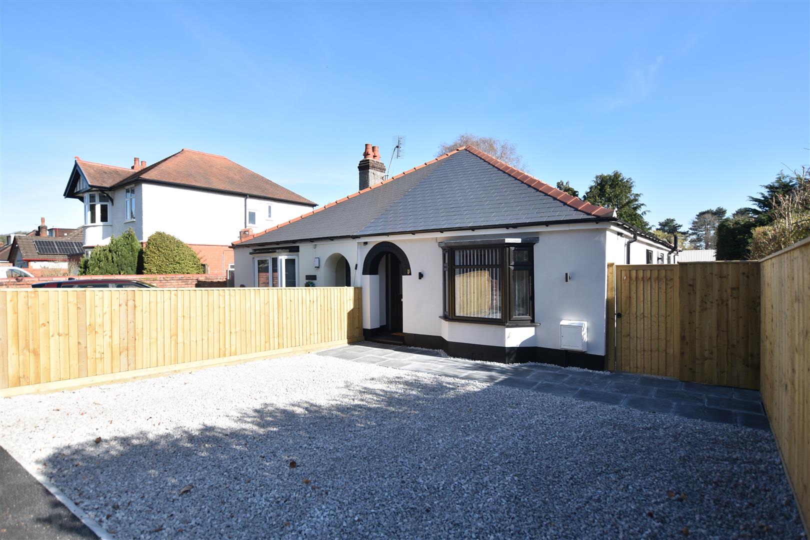 A double width private drive with decorative gravel provides parking and a paved path leads to the entrance porch and then continues through a secure timber gate with sensor lighting to the rear of the bungalow. The rear garden is a particular feature enjoying a pleasant and private outdoor entertaining space with good sized paved patio for BBQ's, lawned garden beyond, cold water tap and new timber fencing.