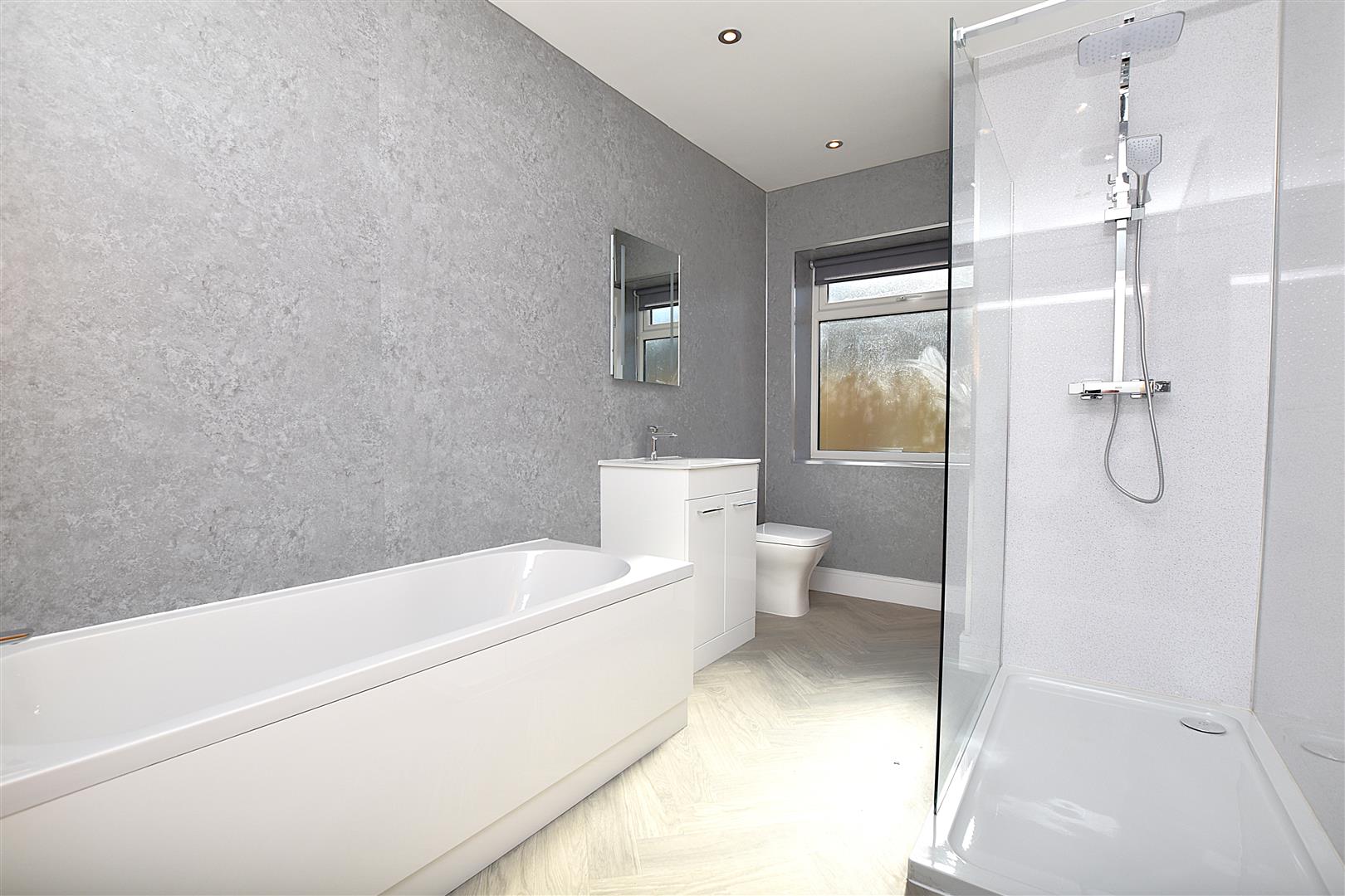 Beautifully appointed with a new white 4 piece suite including a double width walk in shower having mains thermostatic shower unit and drench style shower head, splash screen, bath with chrome mixer tap, wash basin set within a white vanity unit with illuminated wall mirror above, low flush w.c. inset ceiling spotlights, easy clean walls panels, Upvc double glazed window, grey wood effect flooring, heated chrome towel rail and useful store cupboard with new Worcester combination boiler.