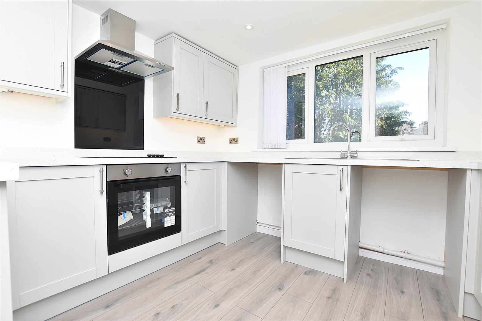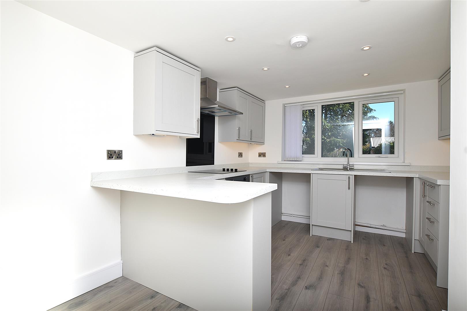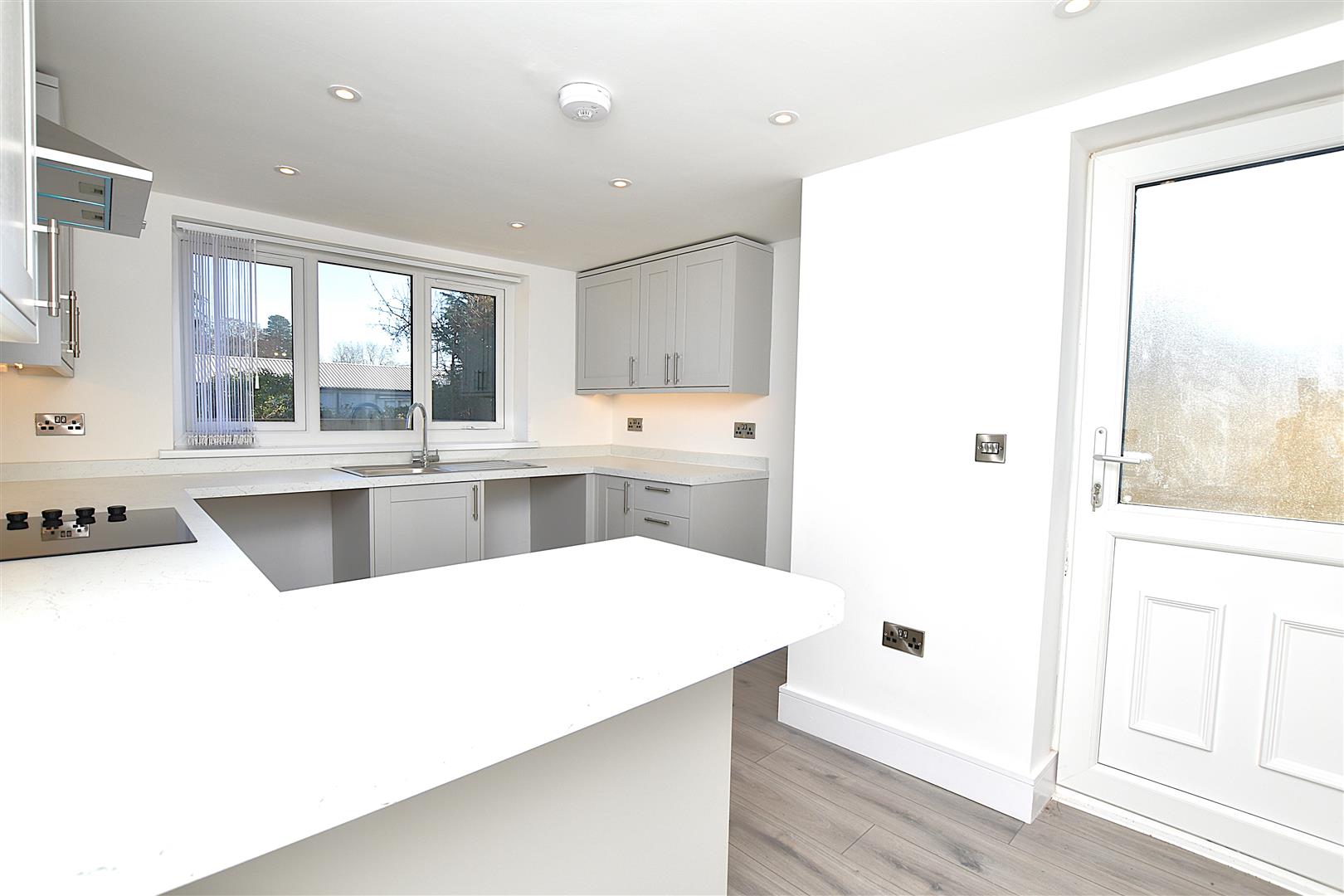 Stylishly appointed with a new grey shaker range of base and wall cupboards complimented by work surface areas with matching upstands incorporating a breakfast bar, stainless steel single drainer sink unit with mixer tap and Upvc double glazed window with fitted blinds above overlooking the rear garden, integrated 4 ring electric hob with oven/grill below, splashback and filter hood above, plumbing for washing machine, space for fridge freezer, plumbing for dishwasher, inset ceiling spotlights, brushed chrome wall fittings, radiator, grey wood effect flooring and Upvc part glazed external door.