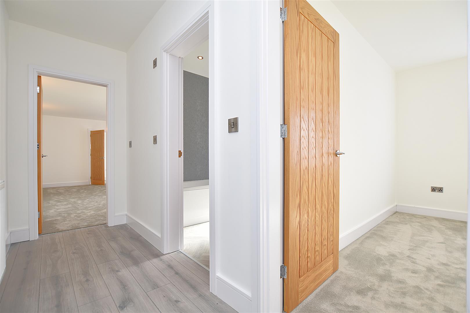 A good sized hall with new grey wood effect flooring, inset ceiling spotlights, 2 radiators, stylish Oak internal veneer doors and ceiling light tunnels.