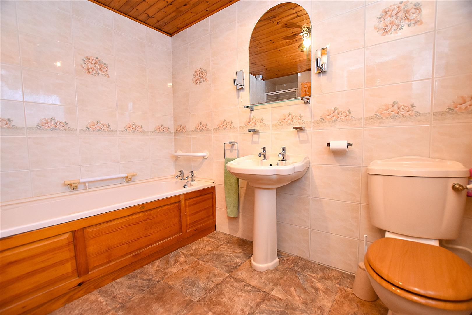 Appointed with a four piece suite of low flush w.c, pedestal wash basin, bath, shower enclosure, radiator, upvc double glazed window, fully tiled walls and storage cupboard.