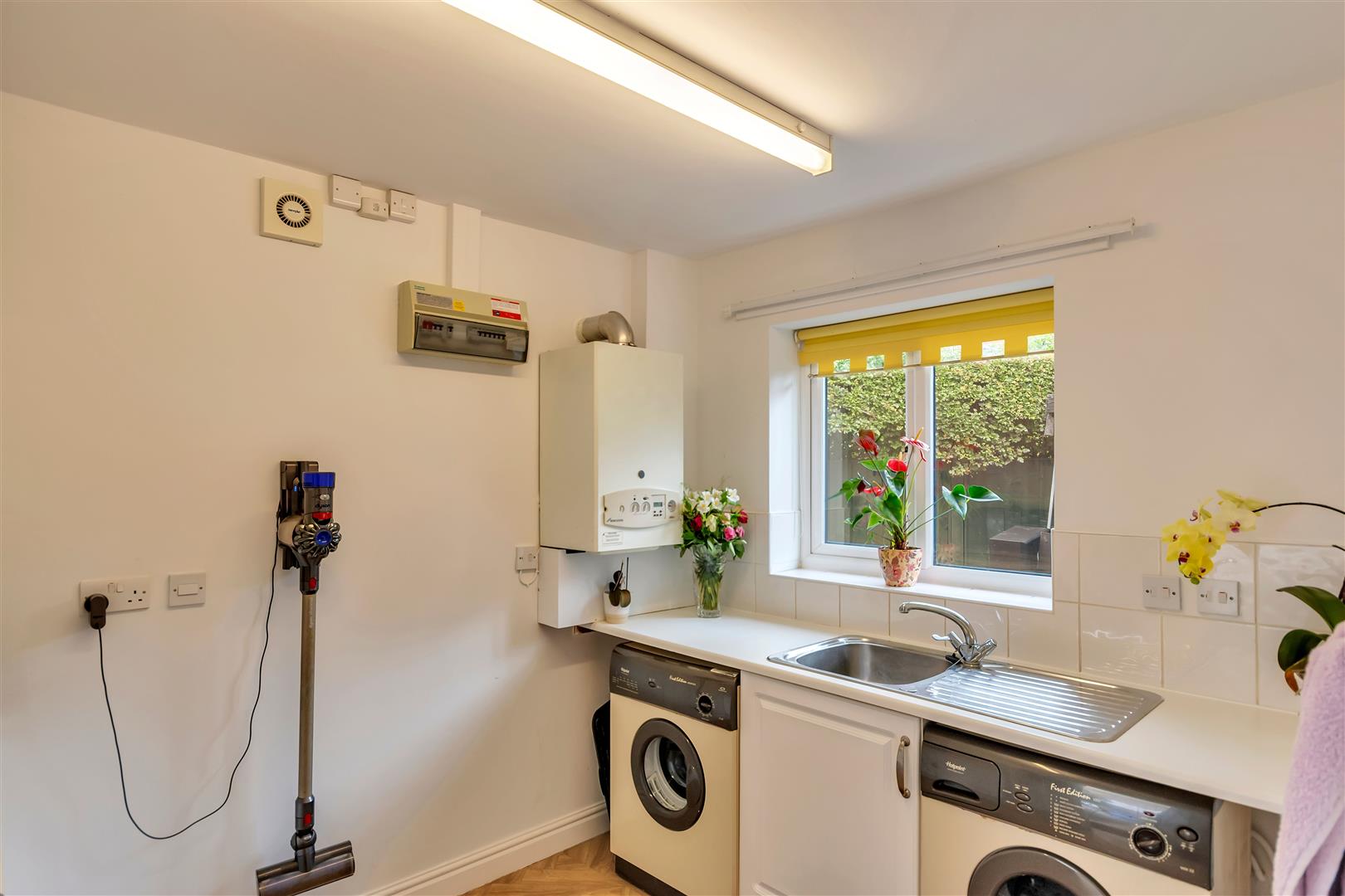 Work surface area with sink unit, mixer tap and cupboard below, plumbing for washing machine, space for dryer, UPVC double glazed window. Wall mounted "Worcester" combi boiler, mains fuse board, extractor fan, UPVC external door to drive.