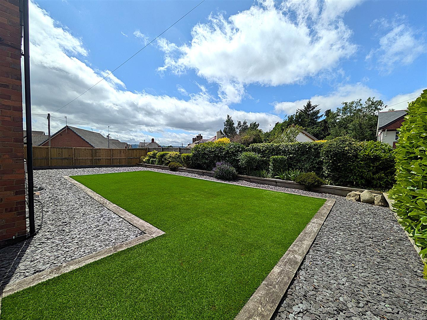 The wide entrance opens to a large private gravelled driveway providing ample parking and turning area alongside a raised flowerbed and timber fencing. A decorative slate path leads to the front entrance door. Gated access from the driveway leads to the large side and rear gardens which offer a fantastic outdoor space that includes two artificial lawned areas, timber decked patio with inset spotlights, raised flowerbeds, double door store shed with covered areas either side, decorative slate to borders, cold water tap, external lights, all of which is enclosed to provide a safe family environment.