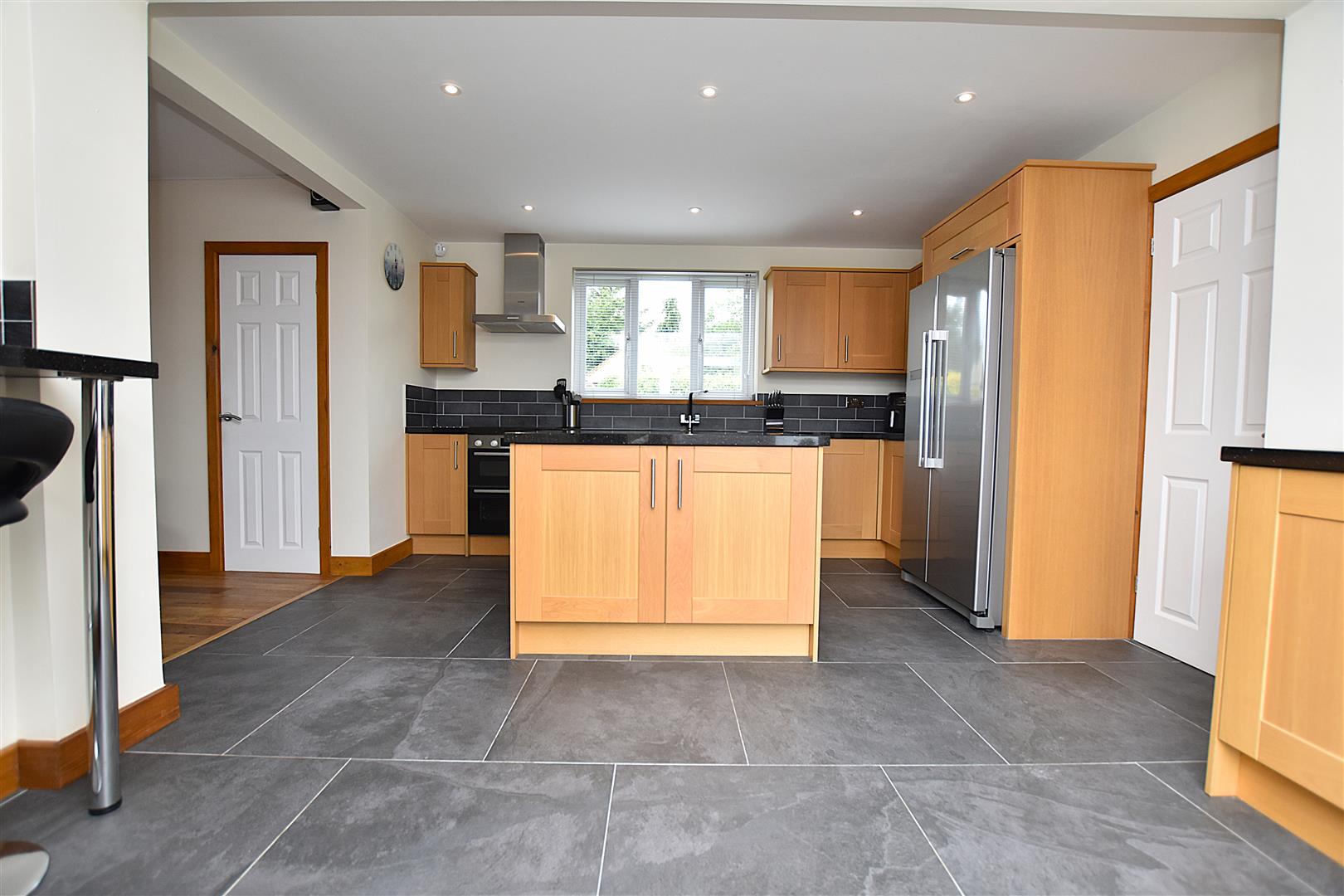 Well appointed with an extensive range of oak effect fronted base and wall cupboards complimented by granite work surface areas incorporating an inset 1 1/2 bowl stainless steel sink unit with chrome mixer tap and ingrained drainer with upvc double glazed window above and oak window sill, four ring Bosch induction hob with Bosch double oven/grill below and Bosch stainless steel extractor hood above, integrated Bosch dishwasher, housing for American style fridge freezer, central island providing additional work surface areas, storage cupboards and drawer units below, breakfast bar with recessed shelving above, part tiled walls, Karndean grey slate effect flooring, inset ceiling spotlights, upvc double glazed external door with matching side windows and six panel door opening to: