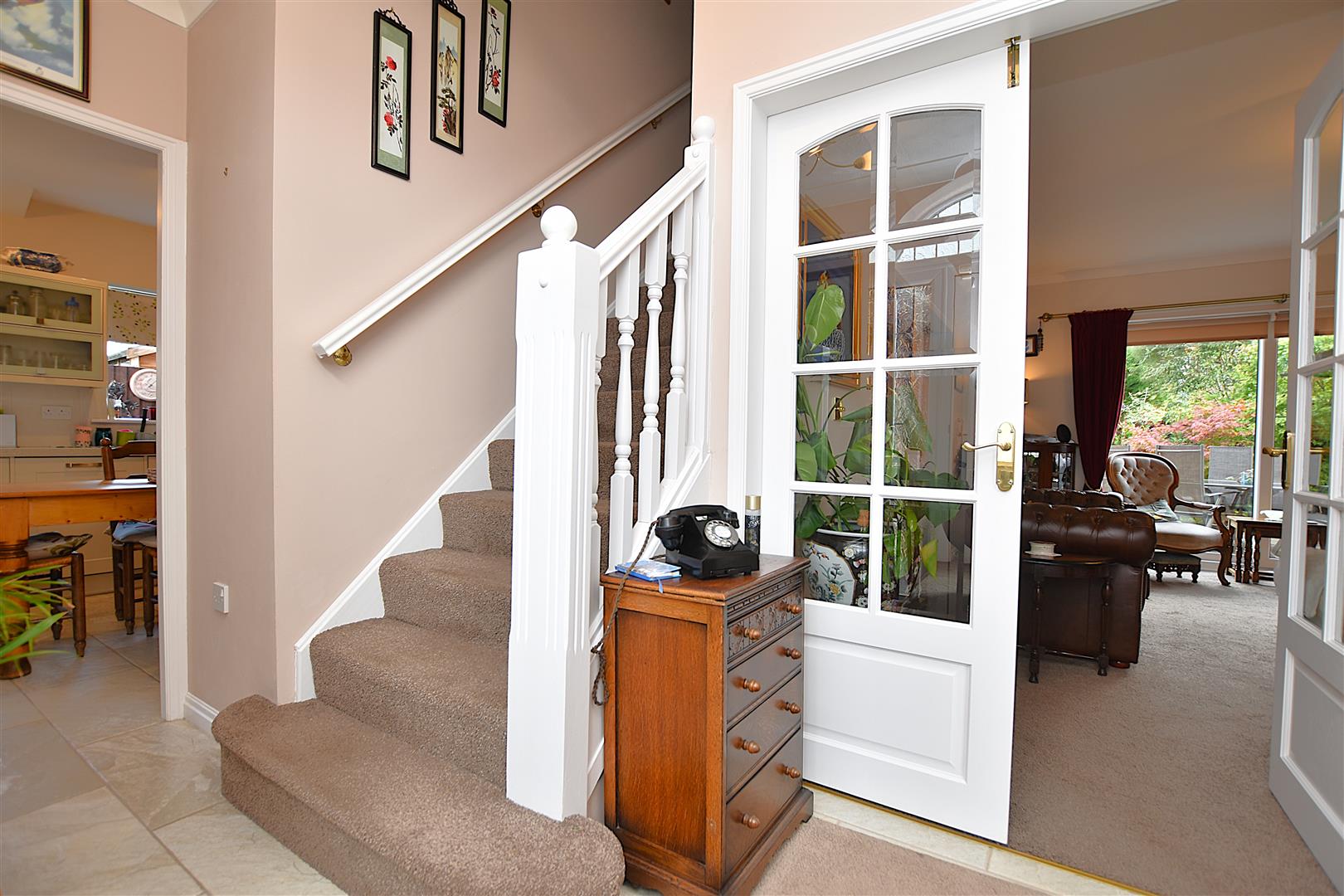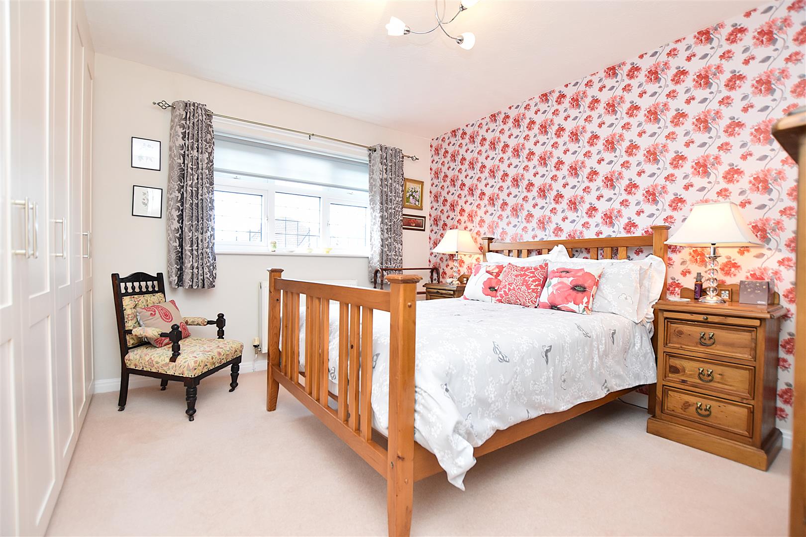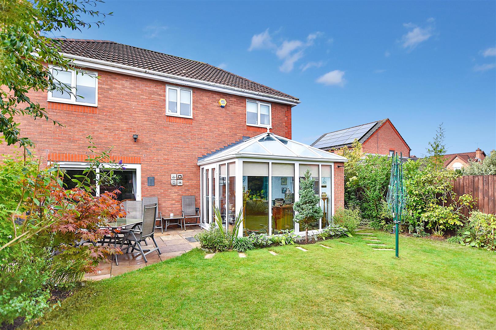 Upgraded by the current owners to provide a spacious and well-appointed 4 double bedroom detached family home with double garage, 2 bathrooms and a conservatory with glazed roof providing an additional reception room overlooking the rear garden. Located within the popular residential development known as ‘The Fairways’ in a cul de sac position having the benefit of a good range of amenities, road links and schools within easy reach. The accommodation briefly comprises a composite entrance door with arch window above, welcoming hall with central staircase, cloaks/w.c. double doors opening to the lounge featuring a living flame gas fire and patio doors to the rear garden. Family sized dining room which connects the conservatory and a stylishly appointed fitted kitchen breakfast room with a modern range of base and wall cupboards and plenty of work surface areas and range style cooker. Bay window fronted home office and a utility within the garage. The 1st floor landing connects the 4 double bedrooms, fitted wardrobes to three bedrooms, and a bay window and en-suite shower room to the principal bedroom. Family bathroom with shower over. To the outside, a private drive with privacy hedging provides ample parking and guest parking and leads to the garage with electric door for ease of use, the utility includes fitted cupboards, plumbing for washing machine and place for dryer. Lawned front garden and gated paths either side lead to the rear garden which provides a pleasant outdoor entertaining space with Indian stone paved patio, storage areas, lawn, well stocked borders and additional seating areas. Energy Rating – C (70).