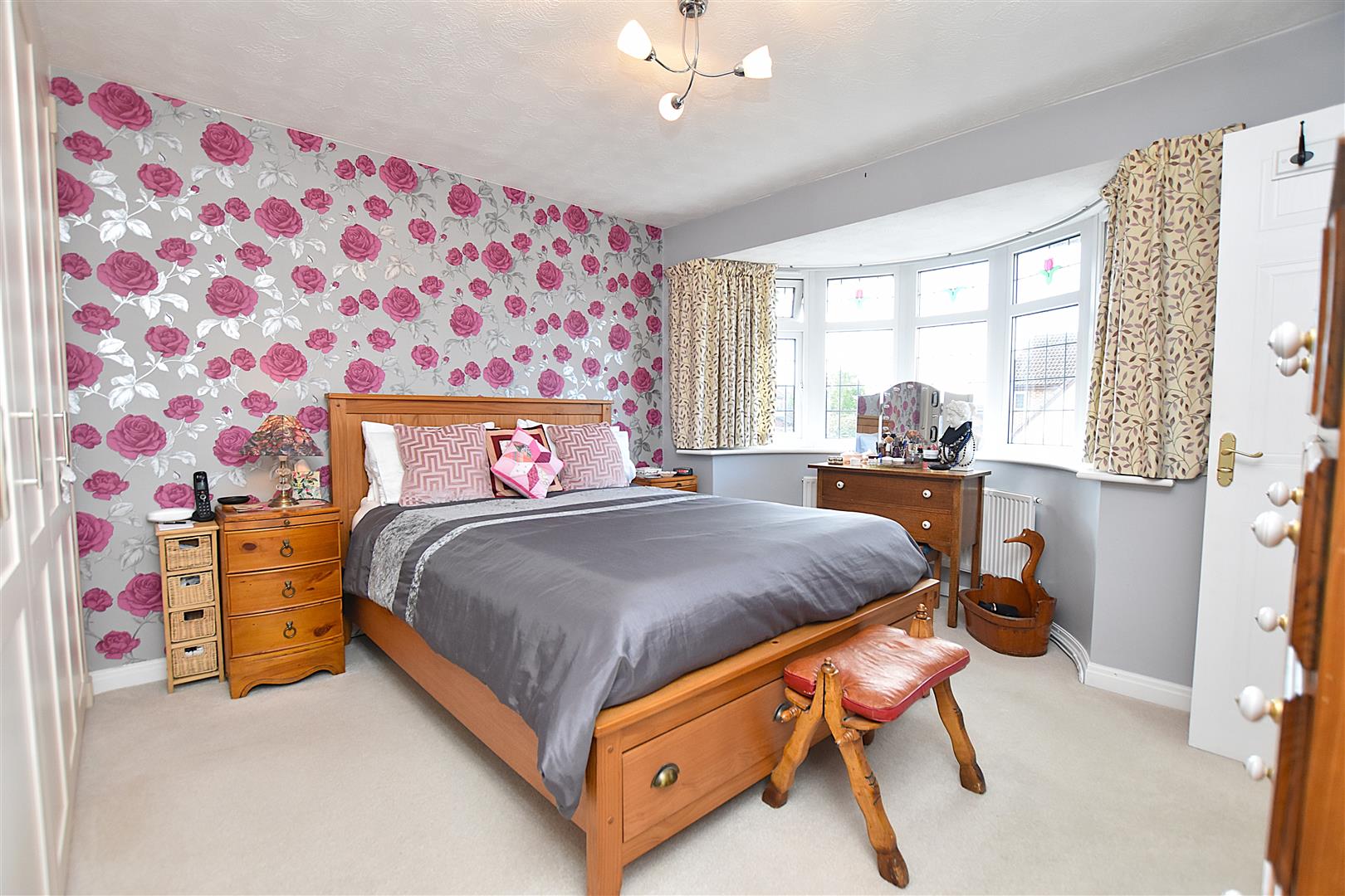 Upvc double glazed bay window with curved radiator below, 5 door fitted wardrobes and connecting door to the en-suite