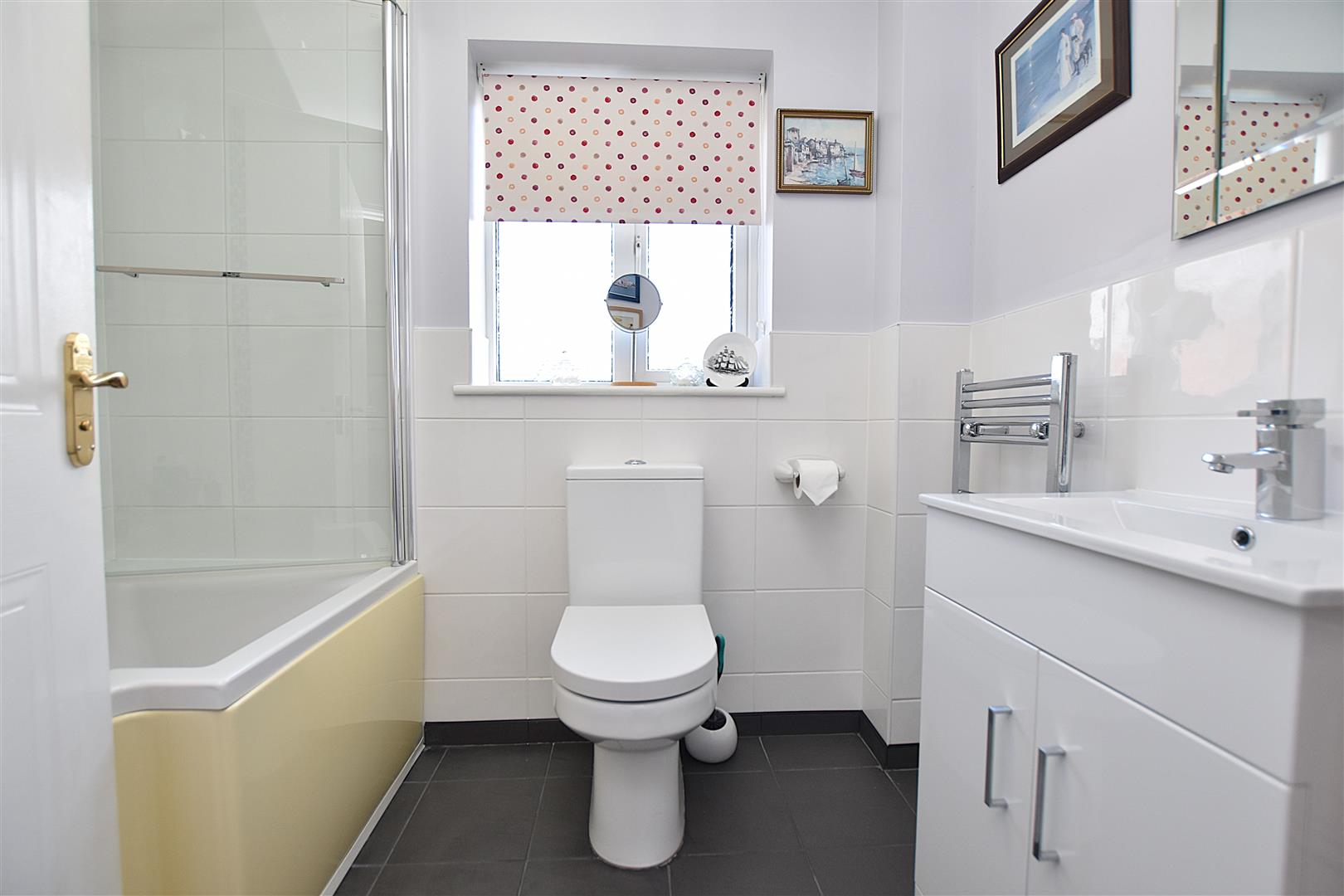 Appointed with a close coupled w.c., wash basin with mixer tap and vanity unit below, 'P' shaped bath with mains thermostatic shower, splash screen, part tiled walls, tiled floor, extractor fan, Upvc double glazed window, chrome heated towel rail and shaver socket.