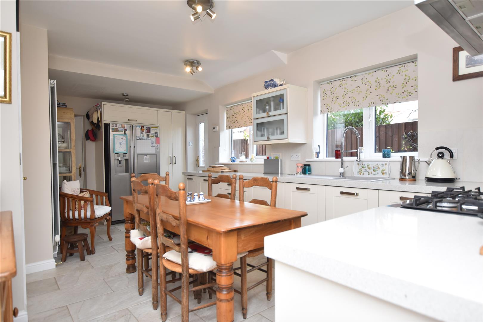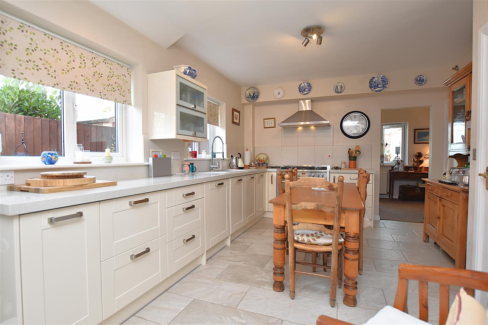 Re- appointed in 2022 to an excellent standard with an extensive range of fitted base and wall cupboards complimented by work surface areas incorporating a 'Franke' sink unit with flexi hose mixer tap, integrated dishwasher, stainless steel range style cooker with 5 burner gas hob and extractor hood above, part tiled walls, pan and cutlery drawers, provision for American style fridge freezer with water connection, larder style cupboard, 2 Upvc double glazed windows, part glazed external door, vertical radiator, useful understairs store cupboard and integral door to garage and utility.
