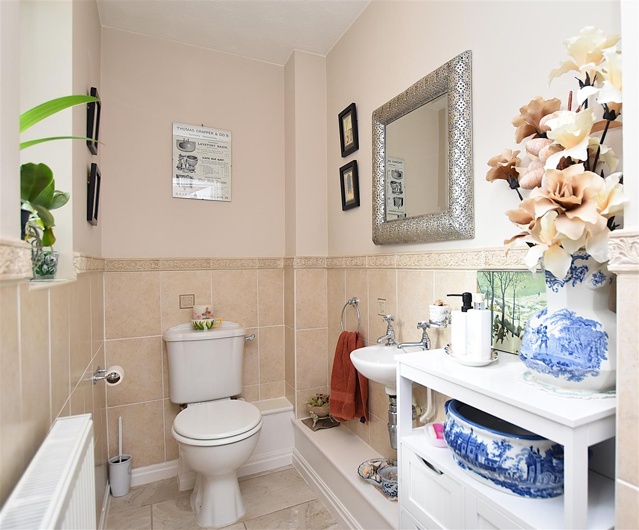 Appointed with a low flush w.c., wash basin, part tiled walls, tiled floor, Upvc double glazed window and radiator.