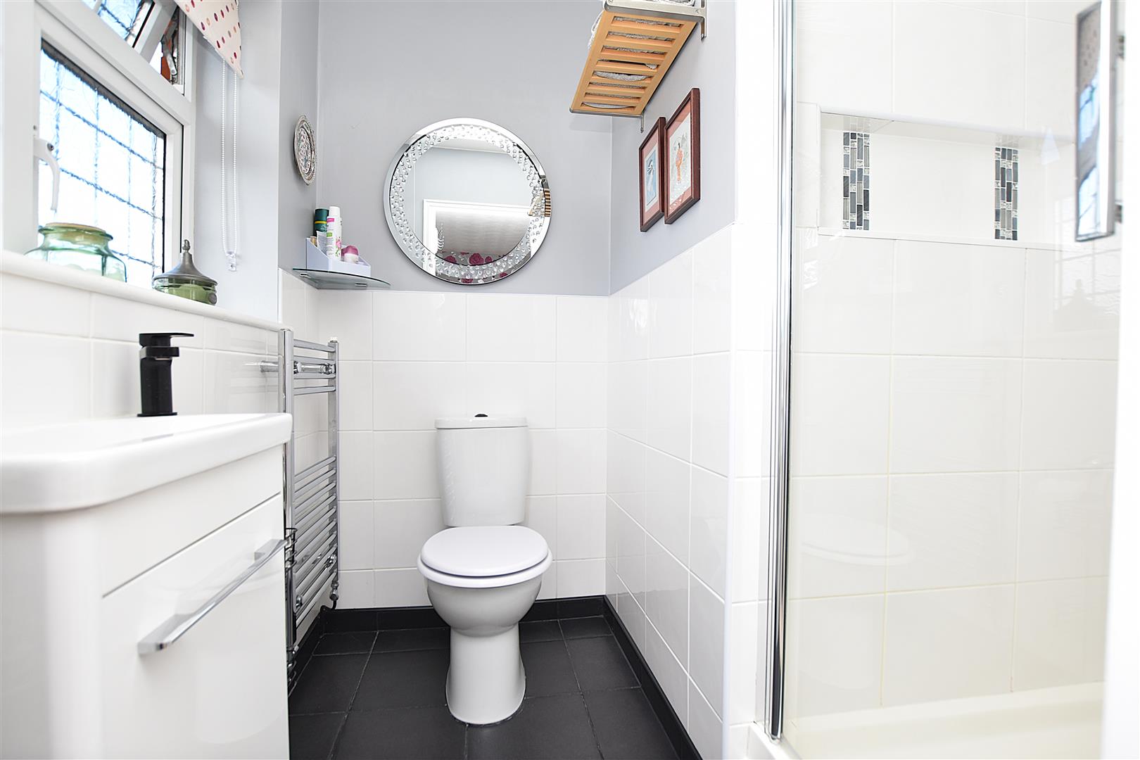 Appointed with a modern white suite of low flush, wash basin with black mixer tap and white gloss vanity unit below, shower enclosure with mains thermostatic shower, part tiled walls, chrome heated towel rail, Upvc double glazed window, extractor fan and tiled floor.