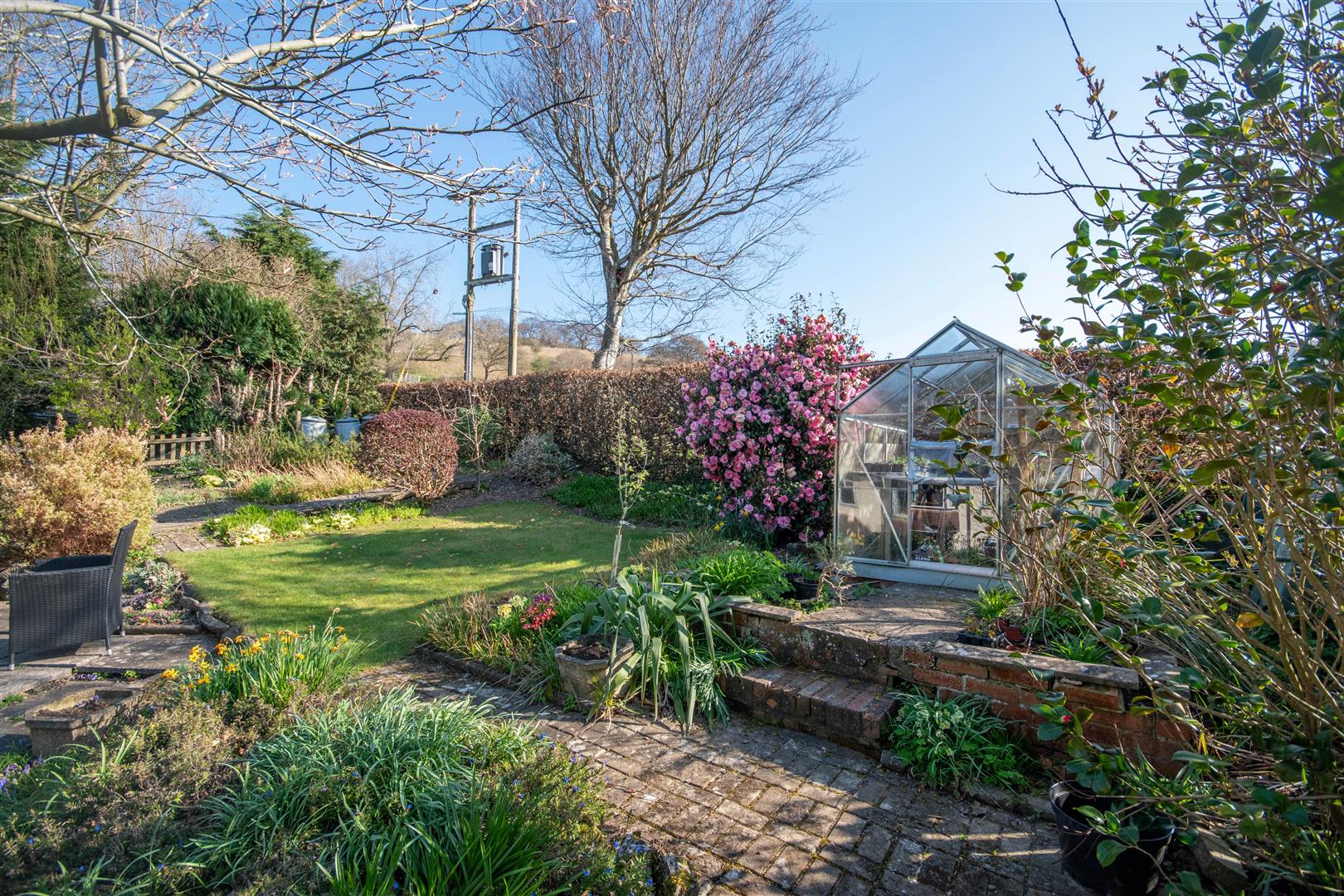 The property is approached via a private driveway providing ample off-road parking and leading to the integral garage. The established front garden features a patterned lawn with well-stocked borders, creating an attractive first impression. A particular highlight of the home is the sunny, rear garden, thoughtfully designed with a layered layout. This wonderful outdoor space includes a stocked rockery, lawned areas, patio seating areas ideal for entertaining, a summer house, vegetable plot, fruit trees, greenhouse and a garden shed to the side. An outside tap adds further practicality.