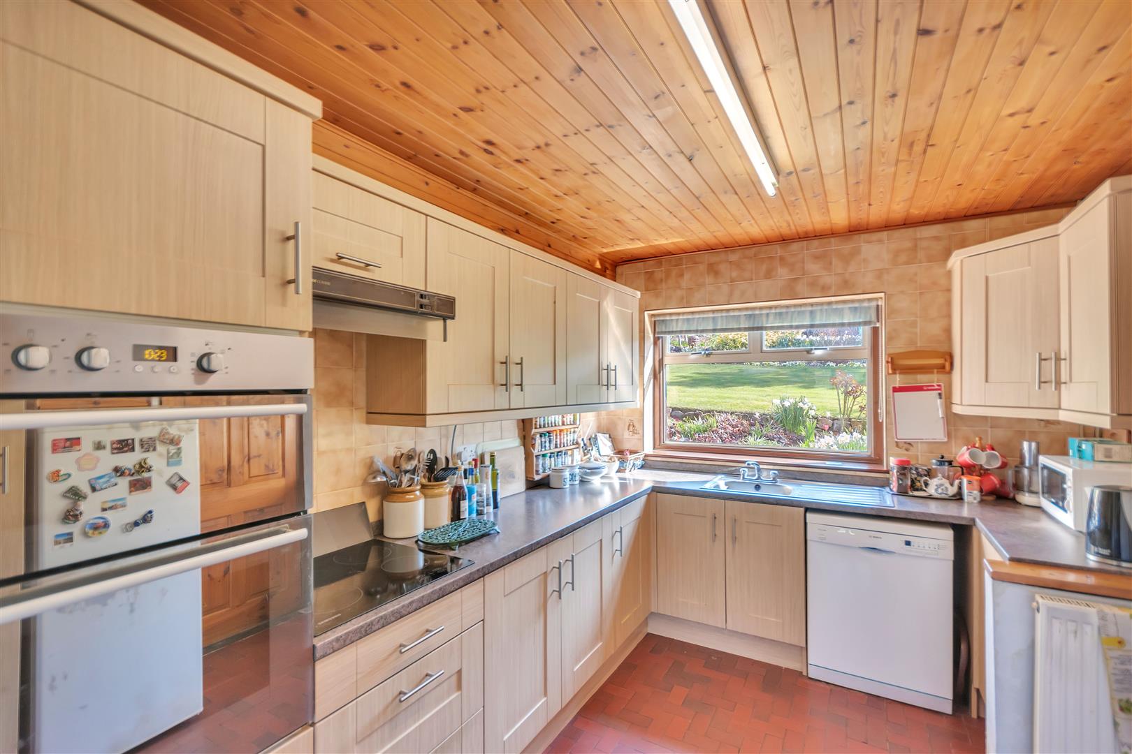 Fitted with a range of base and wall units complimented by work surface areas incorporating sink unit with drainer, window above overlooking the rear garden with views beyond. Electric hob, oven and grill, plumbing for dishwasher, space for fridge freezer, door to:-