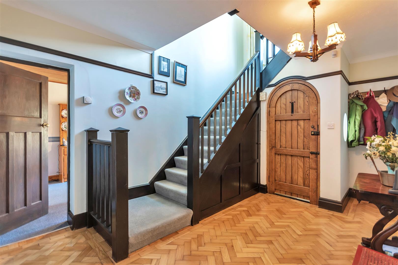 Spacious and welcoming entrance hall with parquet flooring, cloaks area, window to side, staircase rising to the first floor and doors off to all rooms.