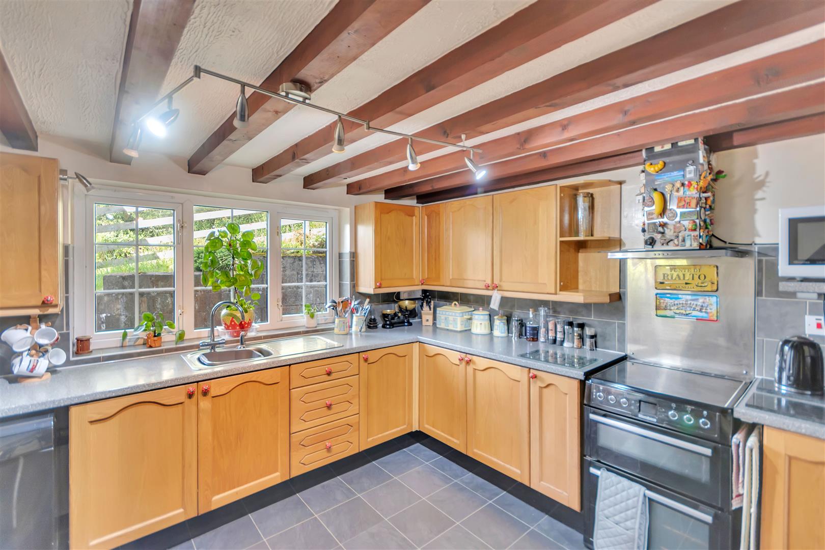 Fitted range of oak base and wall units complimented by work surface areas incorporating sink unit with mixer tap and double glazed window above, cooker hood, space for cooker, breakfast bar, plumbing for dishwasher.