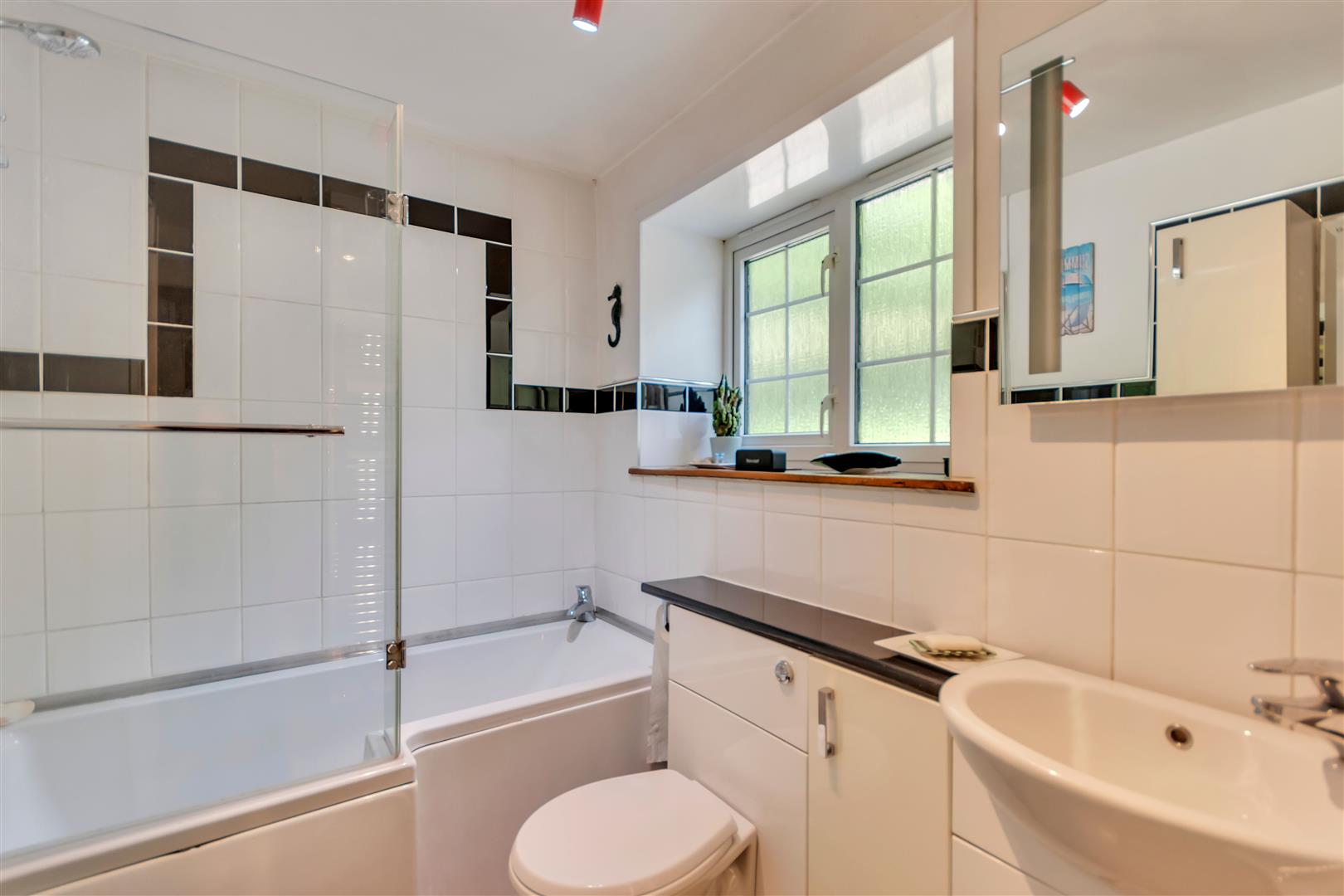 "L" shaped bath with "Mira" electric shower over, towel radiator, heated mirror with lights and shaver socket, frosted double glazed window.