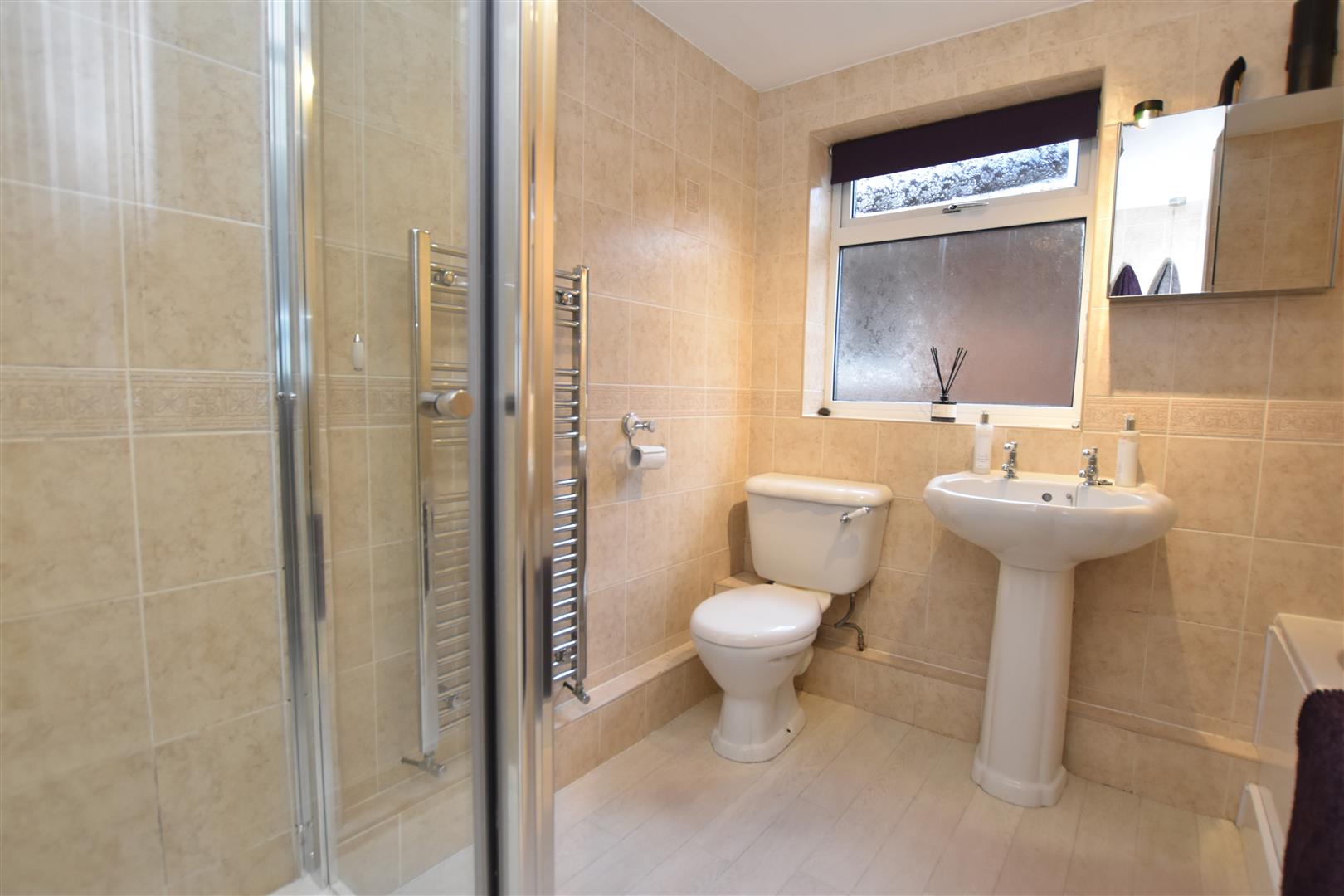An impressive bathroom appointed with a four piece white suite of low flush w.c, pedestal wash basin, bath, separate shower cubicle with mains shower, fully tiled walls, chrome heated towel rail, upvc double glazed window, extractor fan and wood effect flooring.