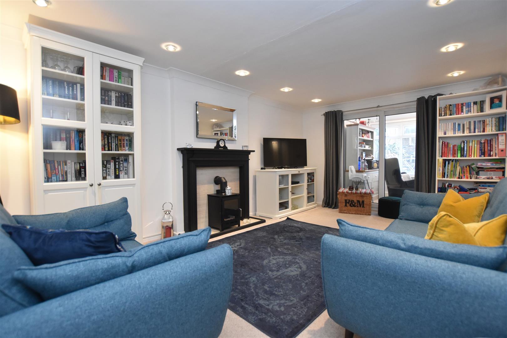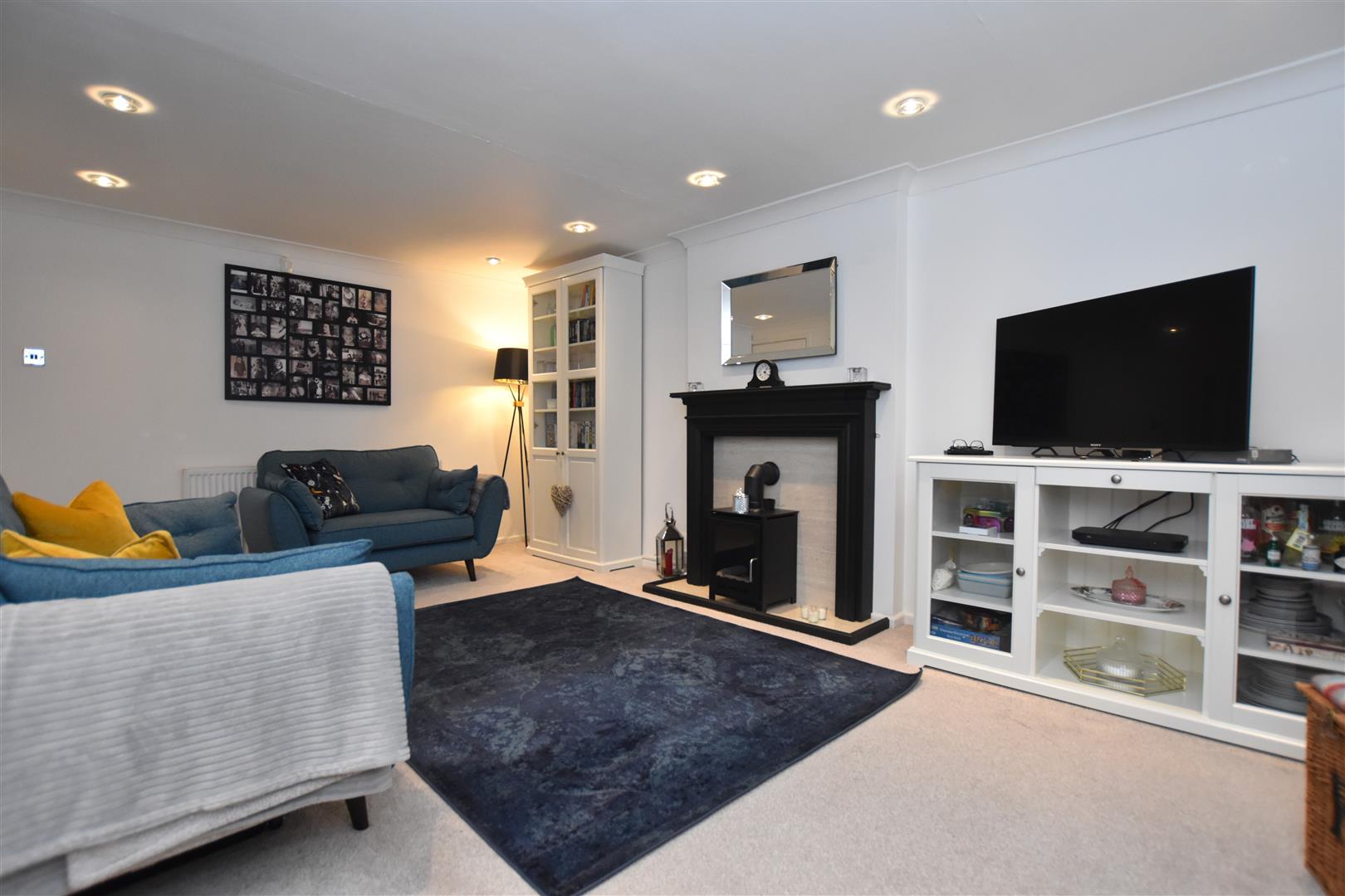 A good sized room with feature fireplace, radiator, neutral carpet, inset ceiling spotlights, part glazed door to kitchen and upvc sliding patio doors that open into the: