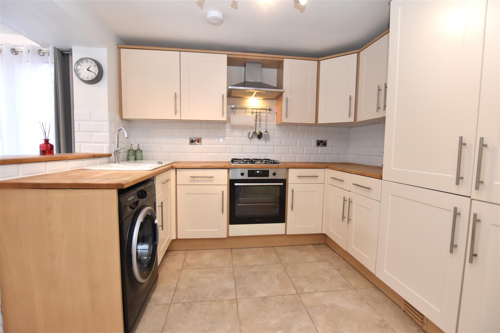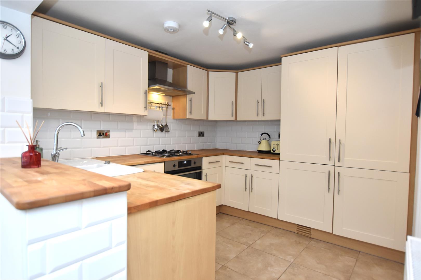 Appointed to an excellent standard with a range of cream shaker style base and wall cupboards complimented by wood block work surfaces incorporating a 1 ½ bowl ceramic sink unit with mixer tap, four ring gas hob with oven below and stainless steel extractor hood above, integrated fridge freezer, plumbing for automatic washing machine, white brick shaped wall tiles to work surface areas, radiator and an internal door into the lounge.