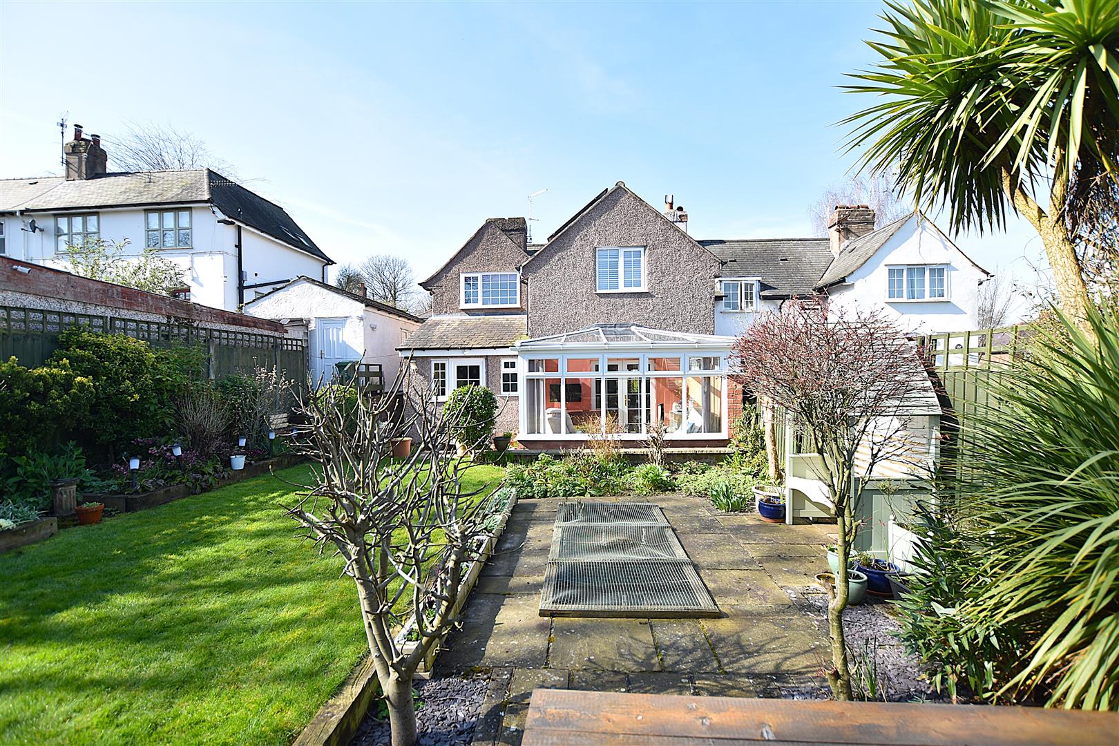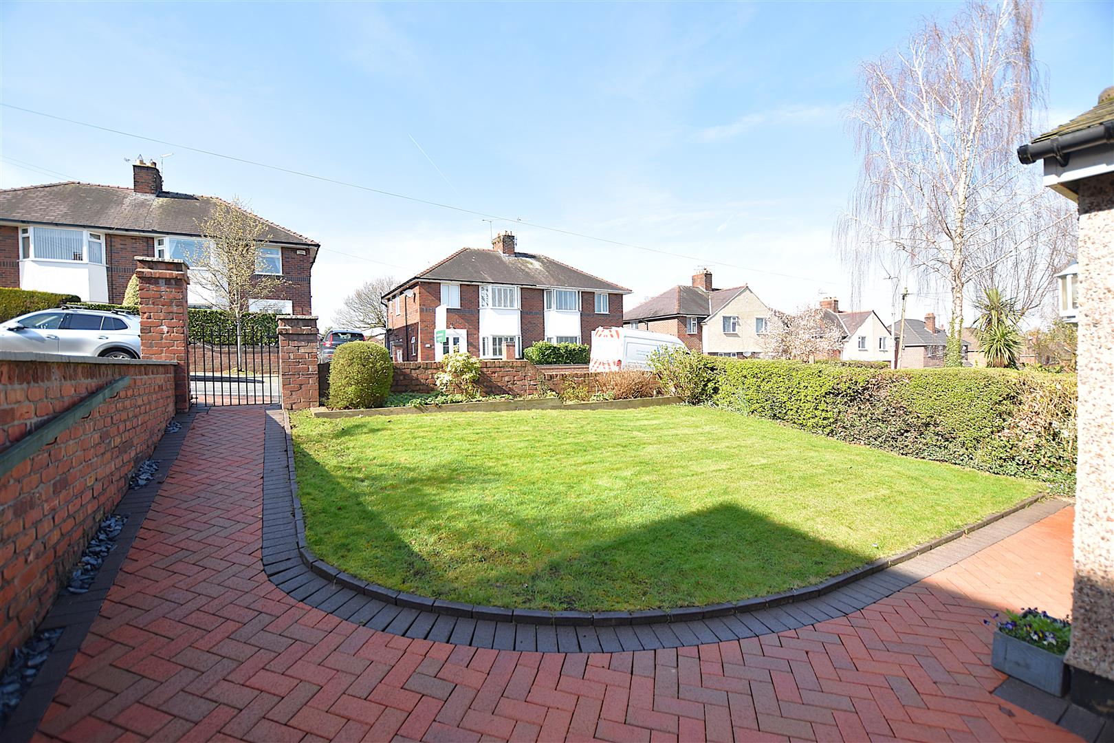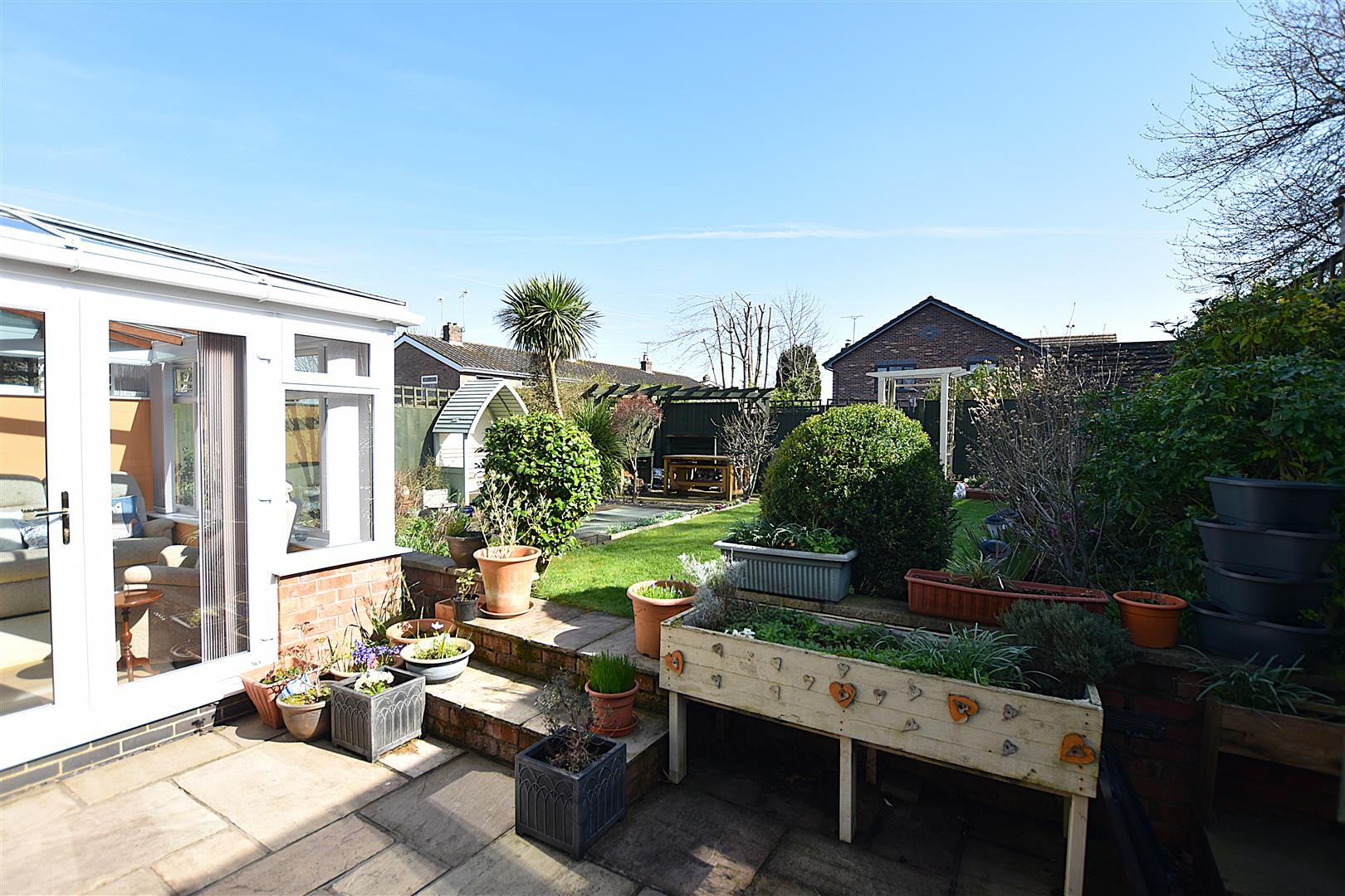 A gated brick paved path leads to the entrance door alongside a mainly lawned garden with low level brick built boundary wall and flowerbeds. A gated path continues to the rear garden which provides an excellent outdoor entertaining space for both adults and children and features Indian stone paved patio for outdoor dining, lawn, ornamental pond, flowerbeds and decorative slate, all of which is enclosed to provide a safe family environment.