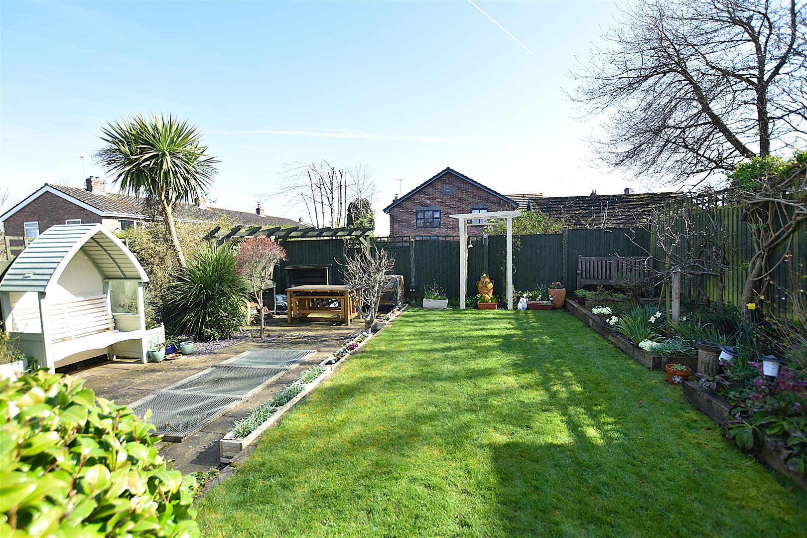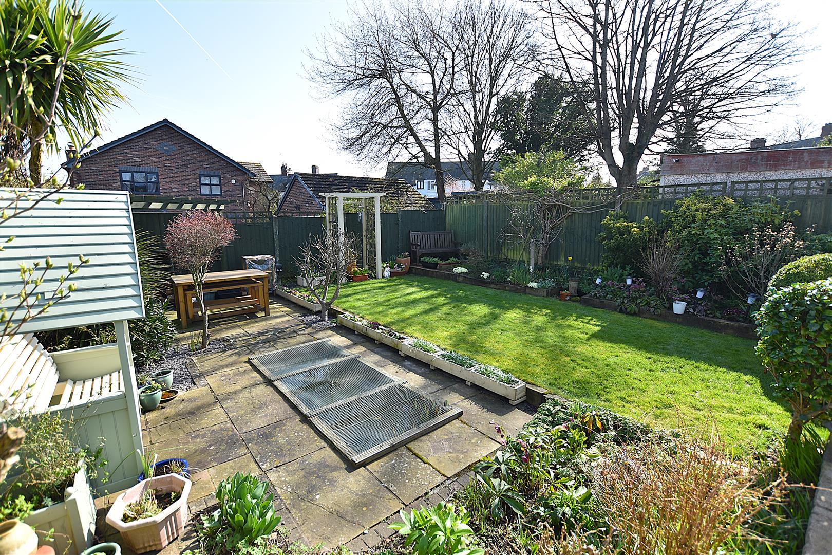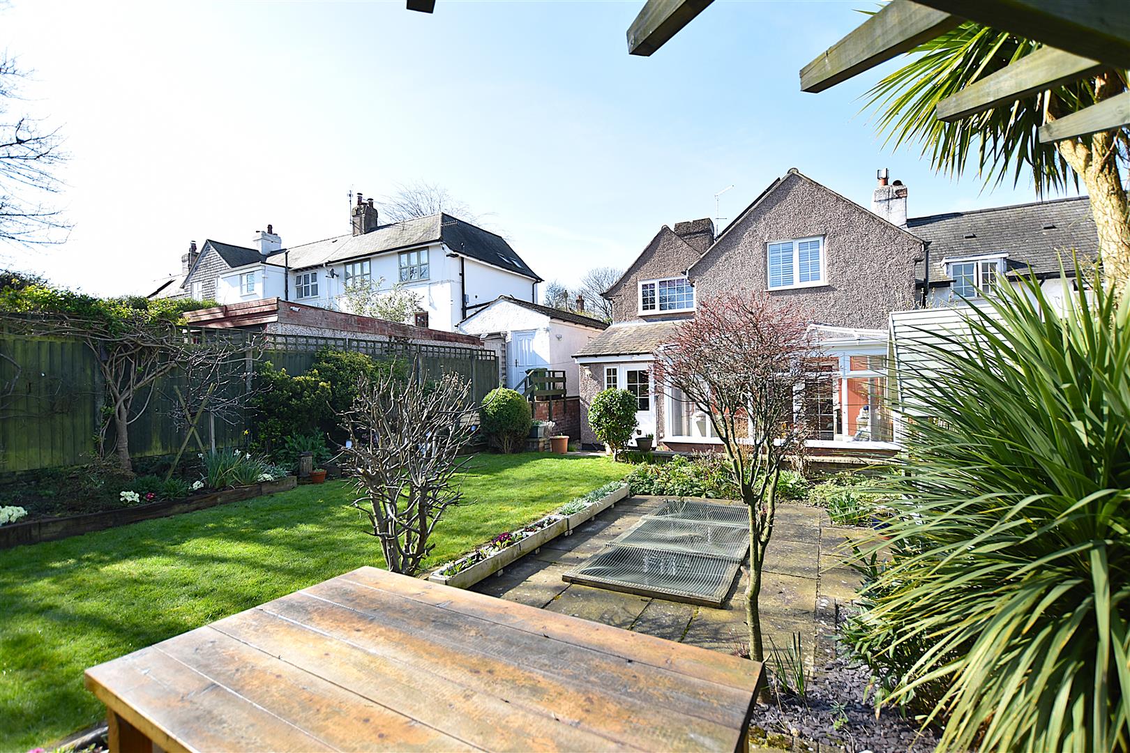 A gated brick paved path leads to the entrance door alongside a mainly lawned garden with low level brick built boundary wall and flowerbeds. A gated path continues to the rear garden which provides an excellent outdoor entertaining space for both adults and children and features Indian stone paved patio for outdoor dining, lawn, ornamental pond, flowerbeds and decorative slate, all of which is enclosed to provide a safe family environment.