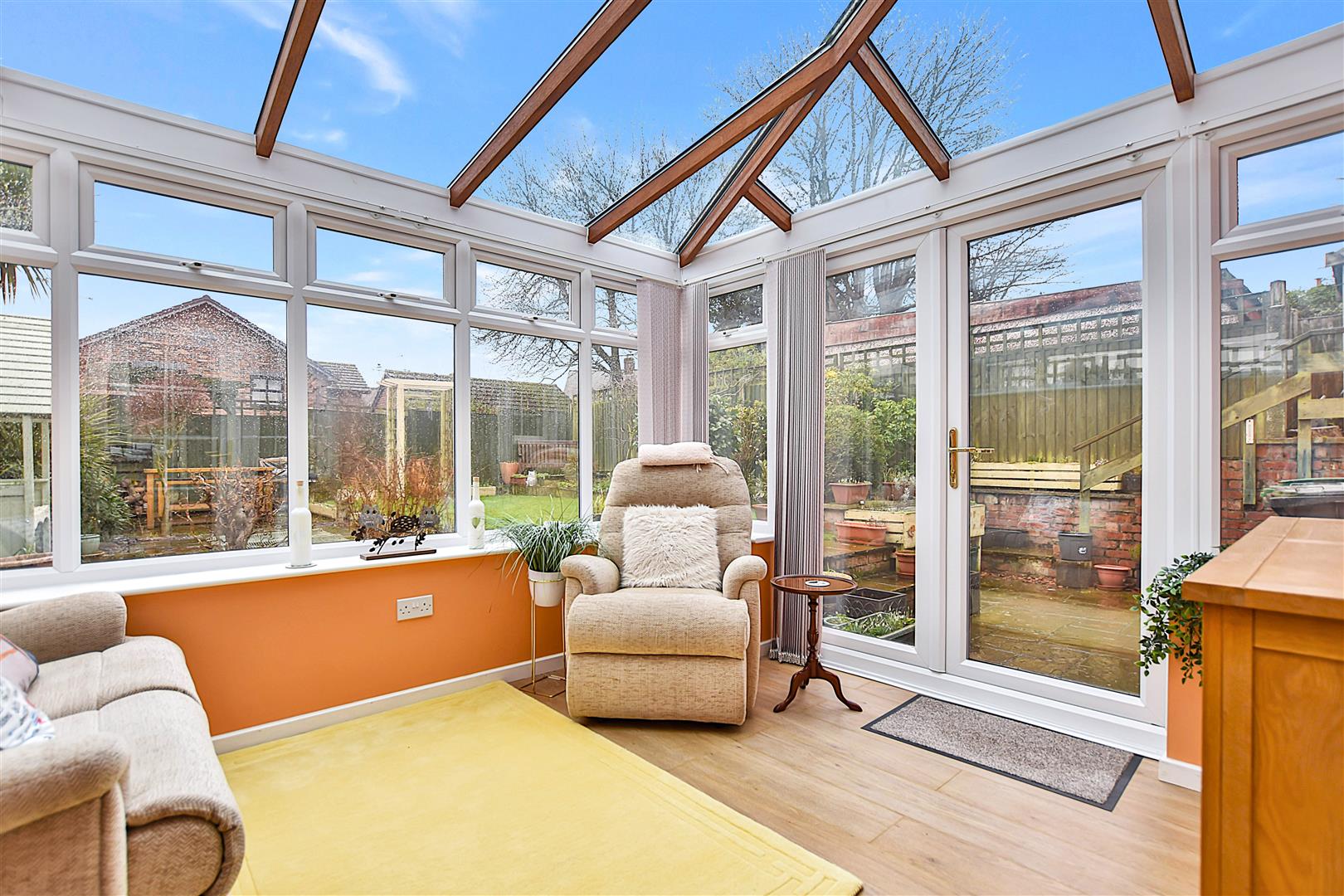 Upvc double glazed windows on a brick plinth overlooking the rear garden, wood effect flooring, glass roof and upvc double glazed French doors opening to the patio.