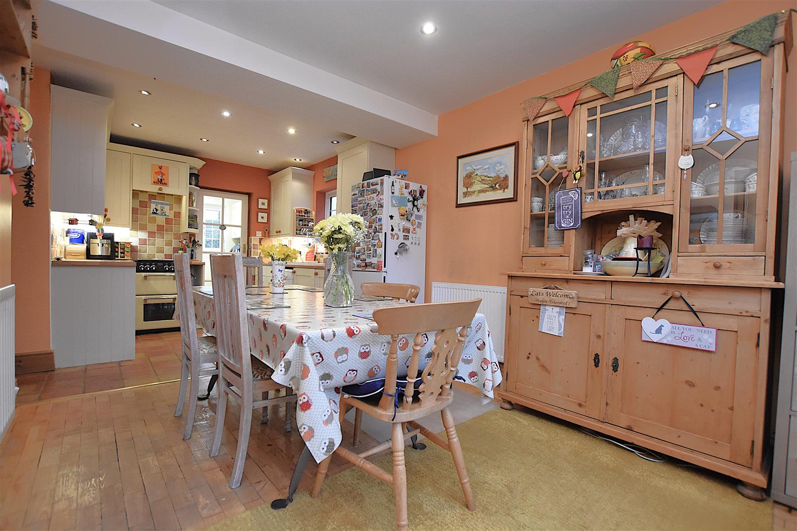 A good sized sociable family space with the kitchen area appointed with a shaker style range of base and wall cupboards complimented by wood effect work surface areas incorporating a ceramic 1 1/2 bowl sink unit with mixer tap and upvc double glazed window above, electric ''Stoves'' cooker with pull-out extractor hood above, concealed Ideal gas central heating boiler, under unit lighting, plumbing for dishwasher, part tiled walls, inset ceiling spotlights and tiled flooring. The dining area features a upvc double glazed walk-in bay window to front, wood block Parquet flooring, two radiators and inset spotlights.
