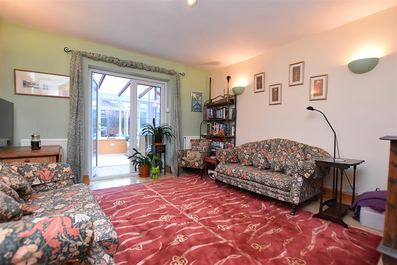 Wood style flooring, two radiators, wall light points and upvc double glazed French doors opening to: