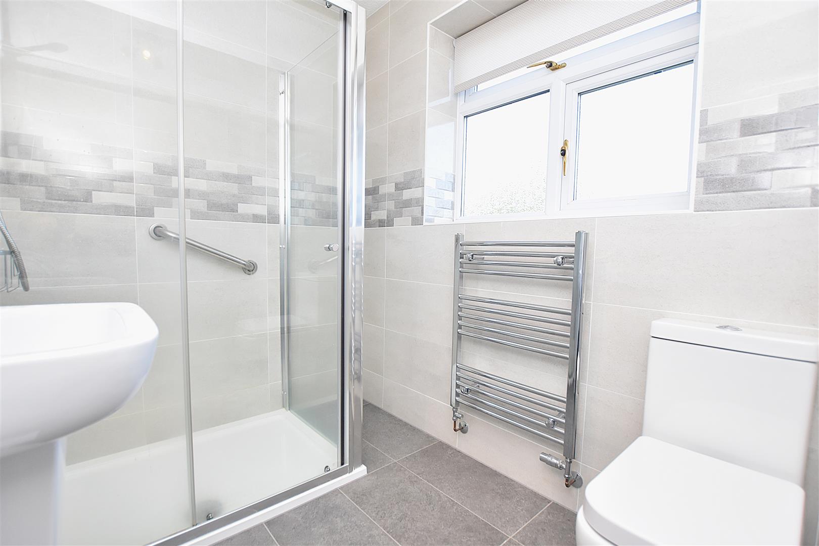 Appointed with a modern white suite of close coupled w.c, pedestal wash basin with mixer tap, shower enclosure, chrome heated towel rail, upvc double glazed window, fully tiled walls and tiled flooring.